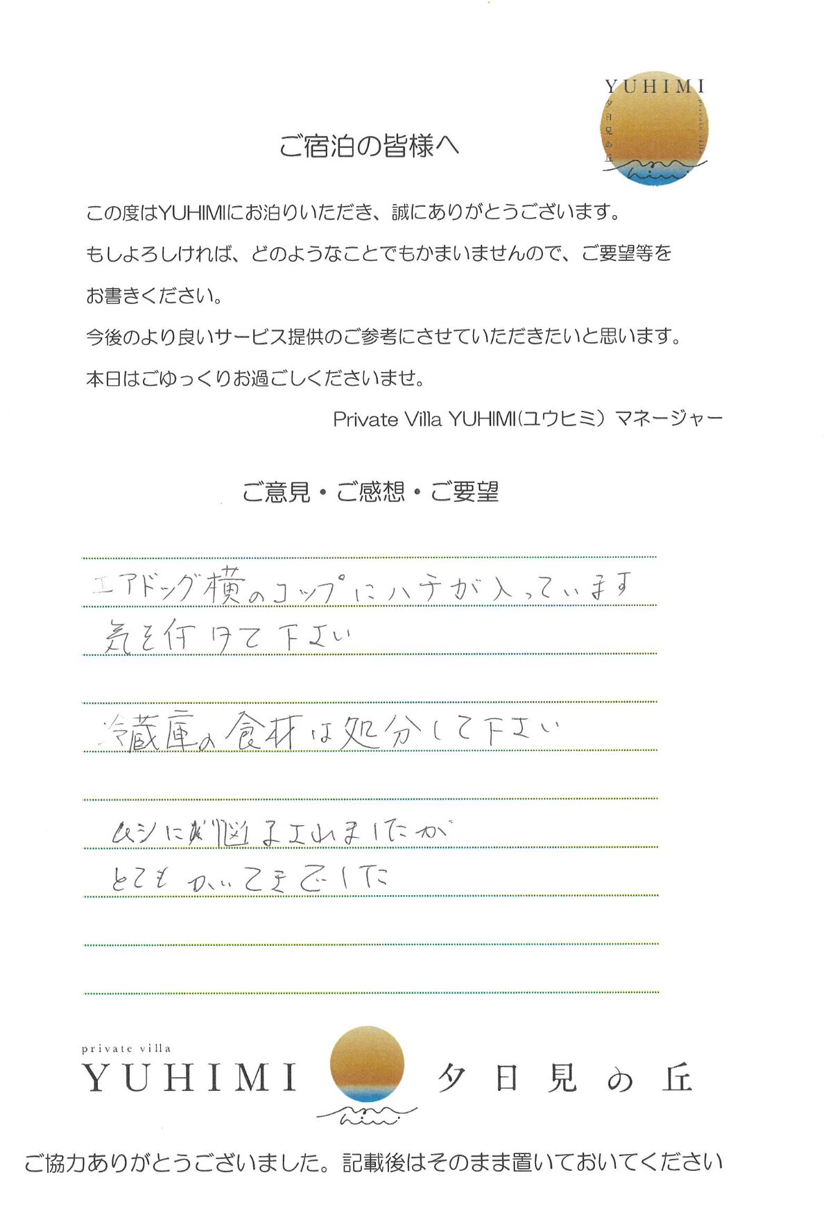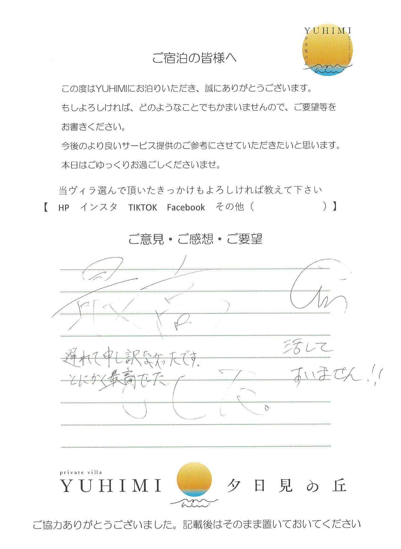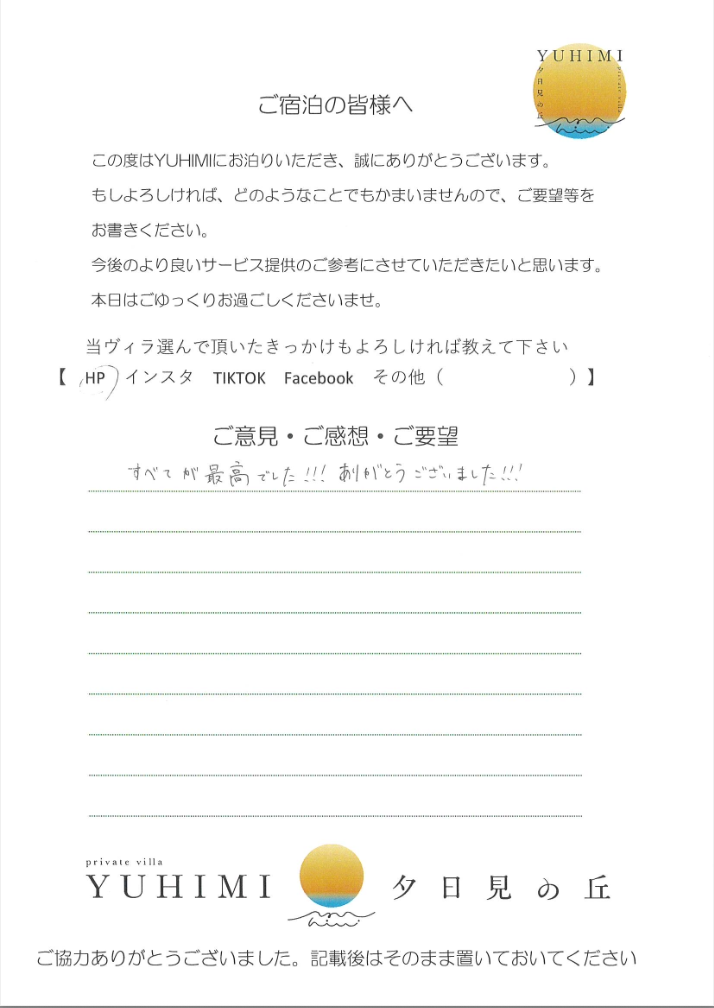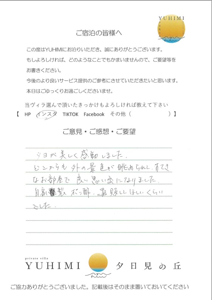 ロケーションも最高で夕日も朝日も思い出に残りました。ステキな部屋で良い時間を過ごすことが出来ました。ありがとうございました。