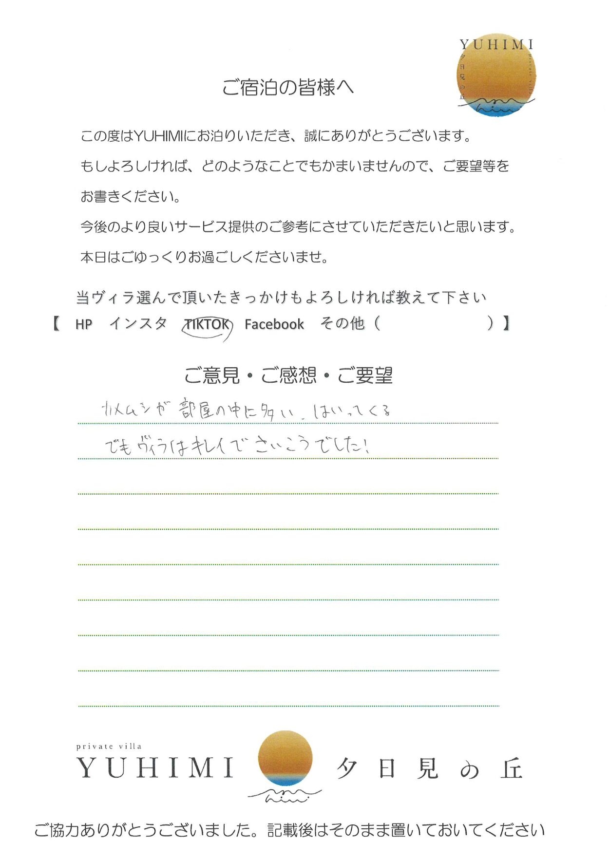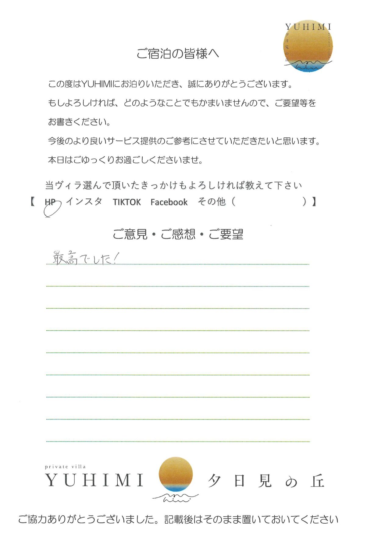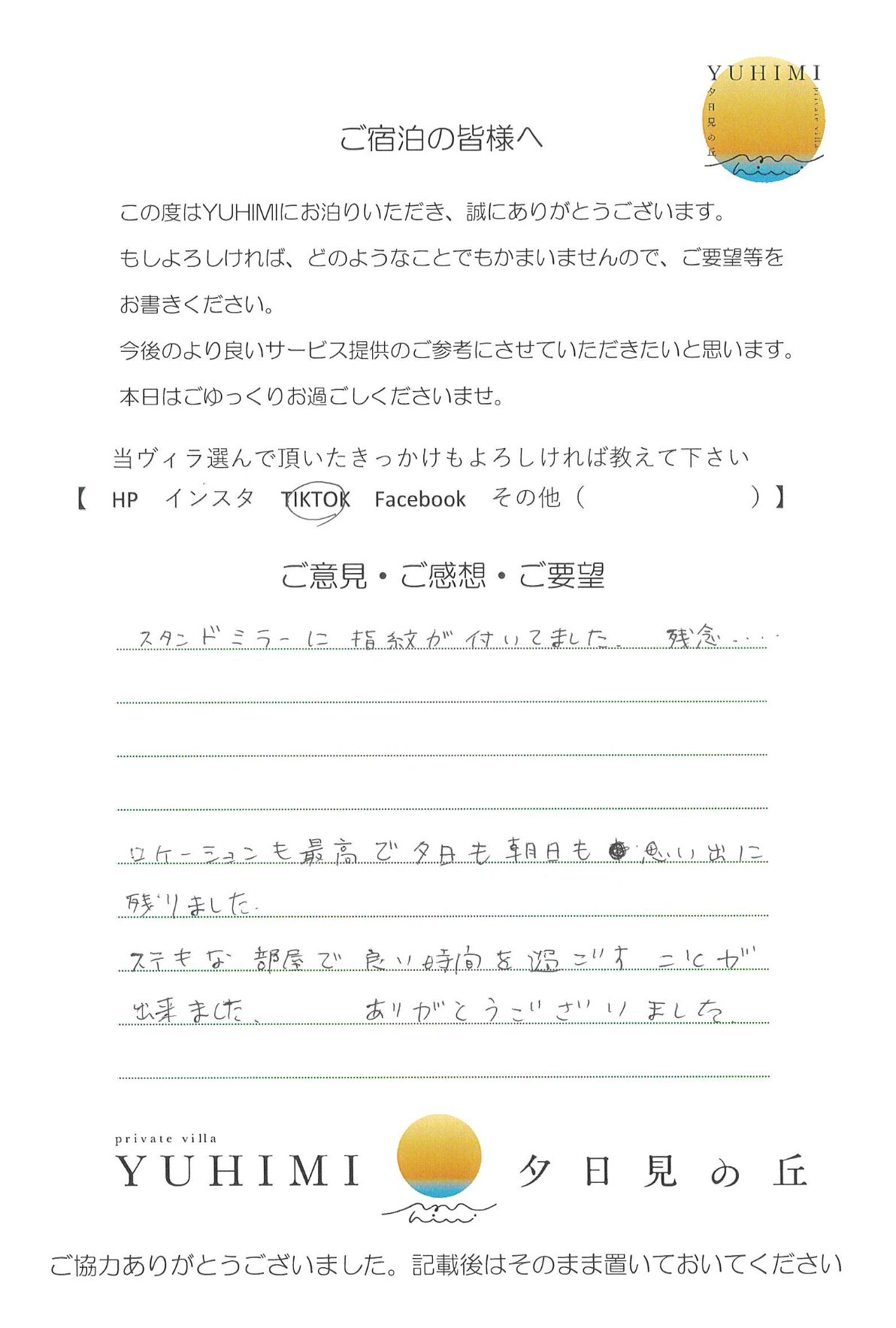 ロケーションも最高で夕日も朝日も思い出に残りました。ステキな部屋で良い時間を過ごすことが出来ました。ありがとうございました。