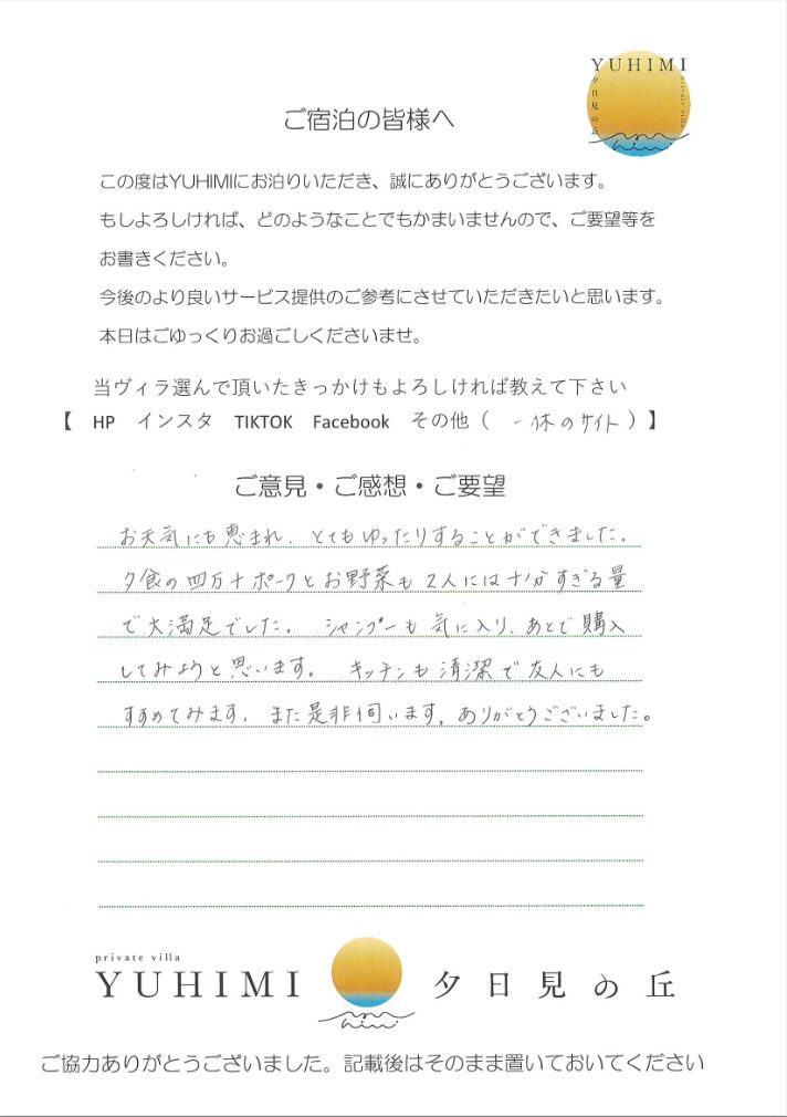 お天気にも恵まれ、とてもゆったりすることができました。夕食の四万十ポークとお野菜も二人には十分すぎる量で大満足でした。シャンプーも気に入り、後で購入してみようと思います。キッチンも清潔で友人にもすすめてみます。また是非伺います。ありがとうございました。