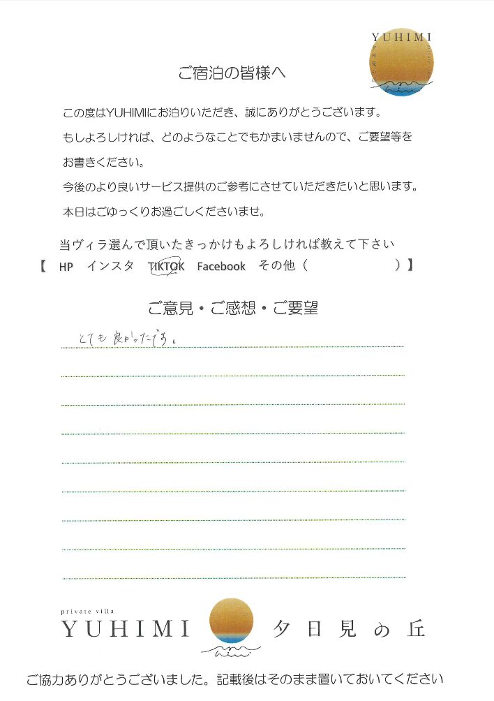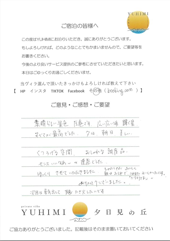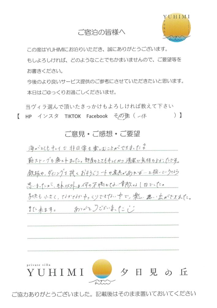 海がとてもキレイで非日常を楽しむことができました。薪ストーブも癒されました。部屋もとてもキレイかつ清潔で気持ち良かったです。鉄板やダイングを拭くおそうじミートや道具があれば強いていうなら思いましたが、それ以外は何の不満もない素敵な1日でした。子供も小さく、なかなかゆっくりできない中で、楽しい思い出ができました。また来ます。ありがとうございました。