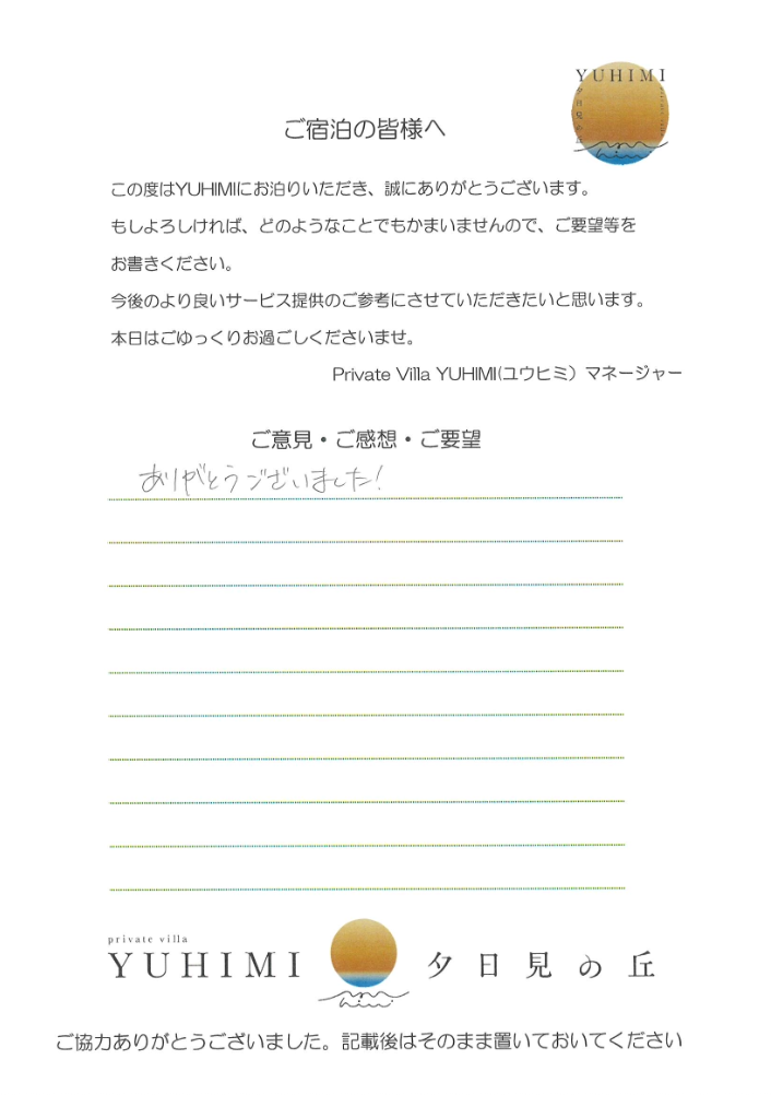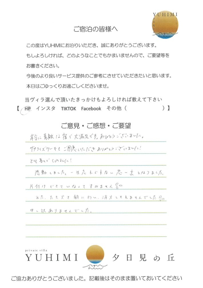 本当に素敵な宿で大満足です。ありがとうございました。サプライズケーキもご用意いただき、ありがとうございました!とても喜んでいました!感動しました。一生忘れられない思い出となりました。片付けできていなくてすみません。
