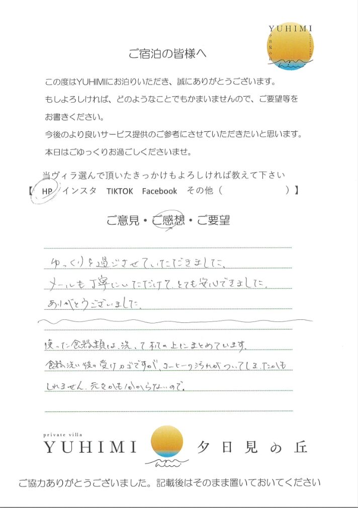 ゆっくりを過ごさせていただきました。メールも丁寧にいただいて、とても安心できました。