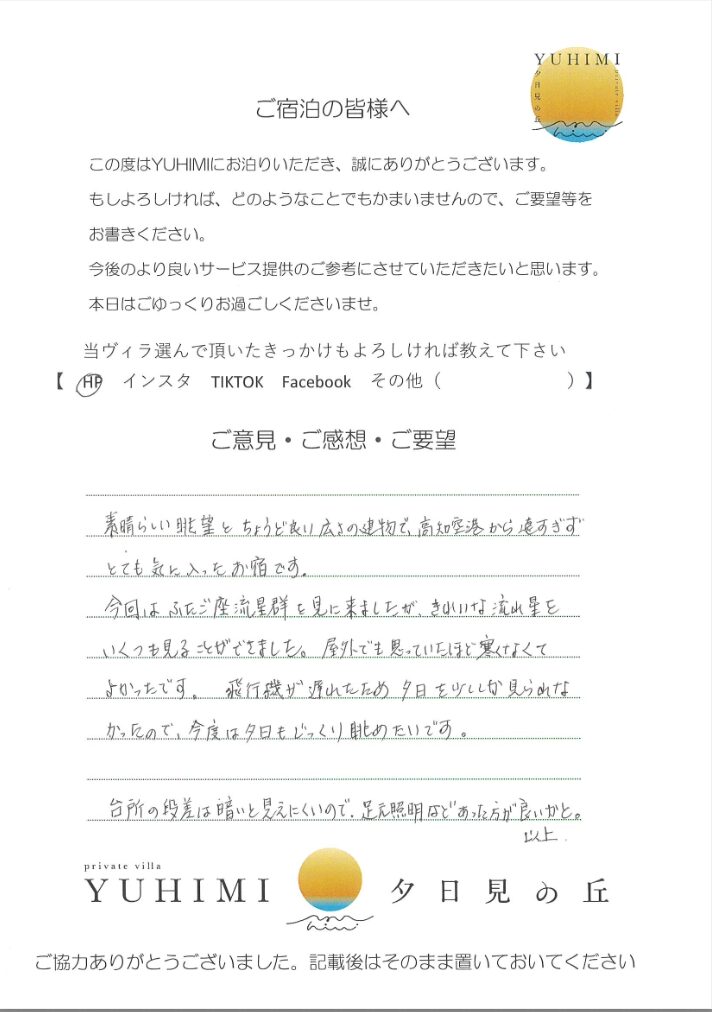 素晴らしい眺望とちょうど良い広さの建物で、高知空港から遠すぎずとても気に入ったお宿です。今回はふたご座流星群を見に来ましたが、きれいな流れ星をいくつも見ることができました。屋外でも思っていたほど寒くなくて良かったです。飛行機が遅れたため夕日を少ししか見られなかったので、今度は夕日もゆっくり眺めたいです。