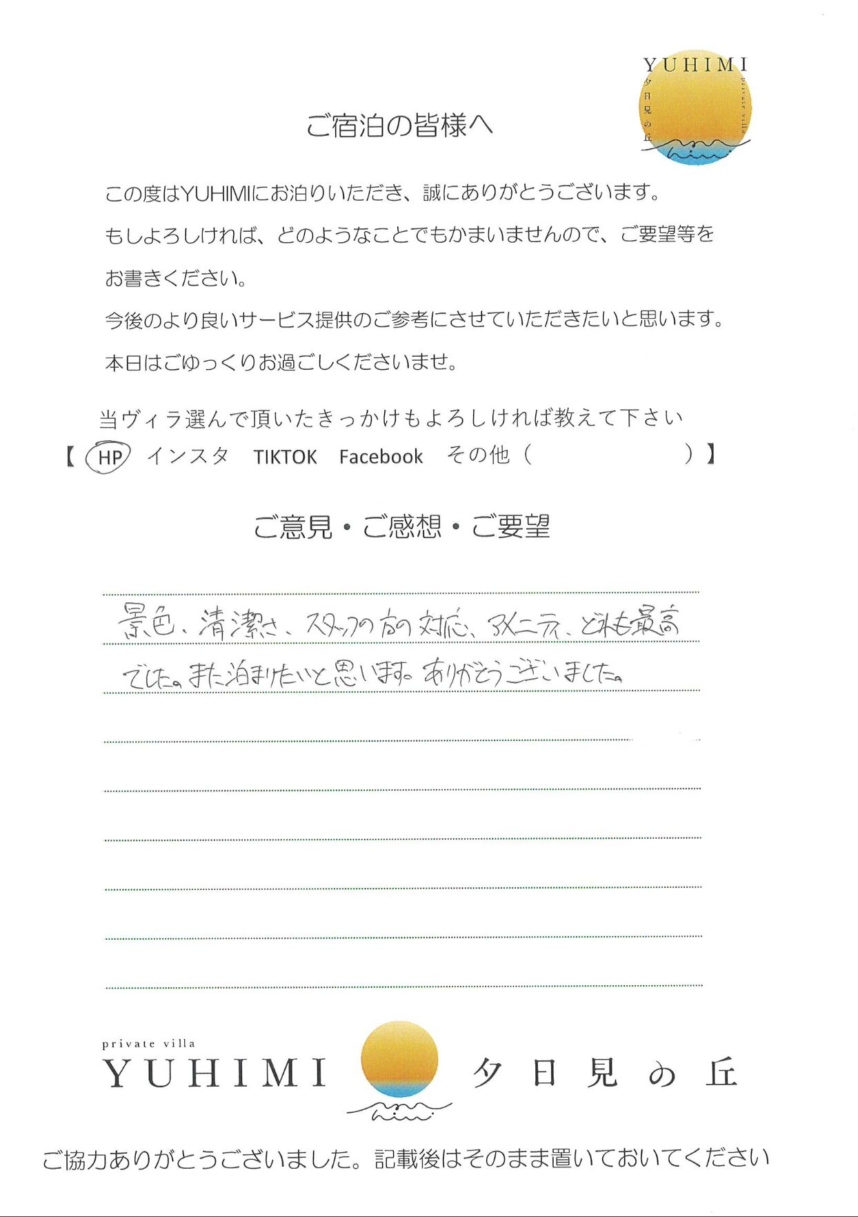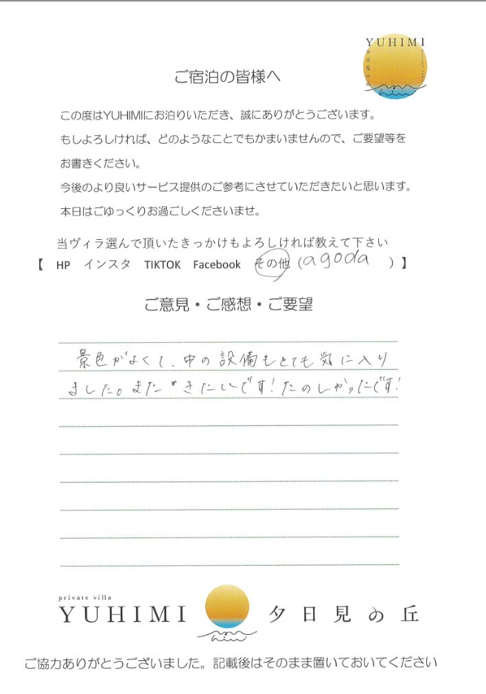 景色、清潔さ、スタッフの方の対応、アメニティ、とても最高でした。また泊まりたいと思います。ありがとうございました。