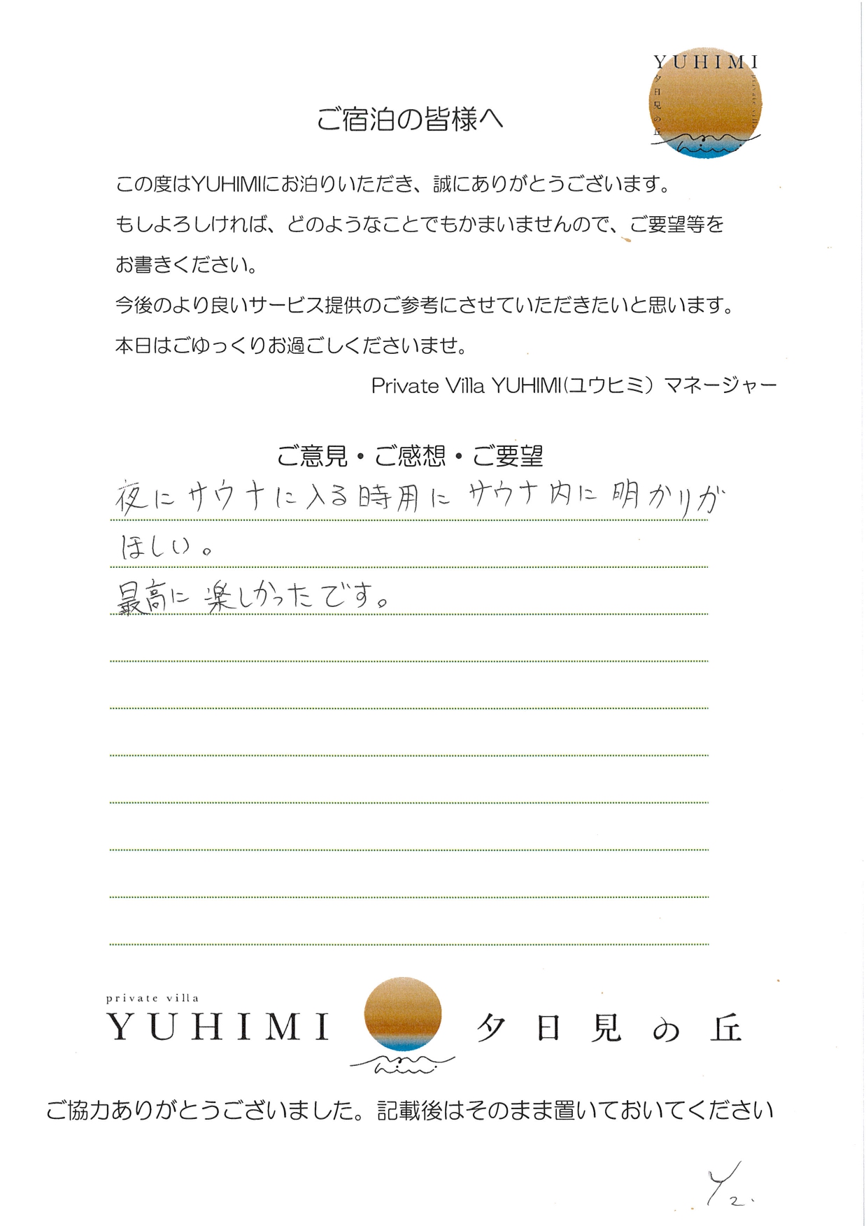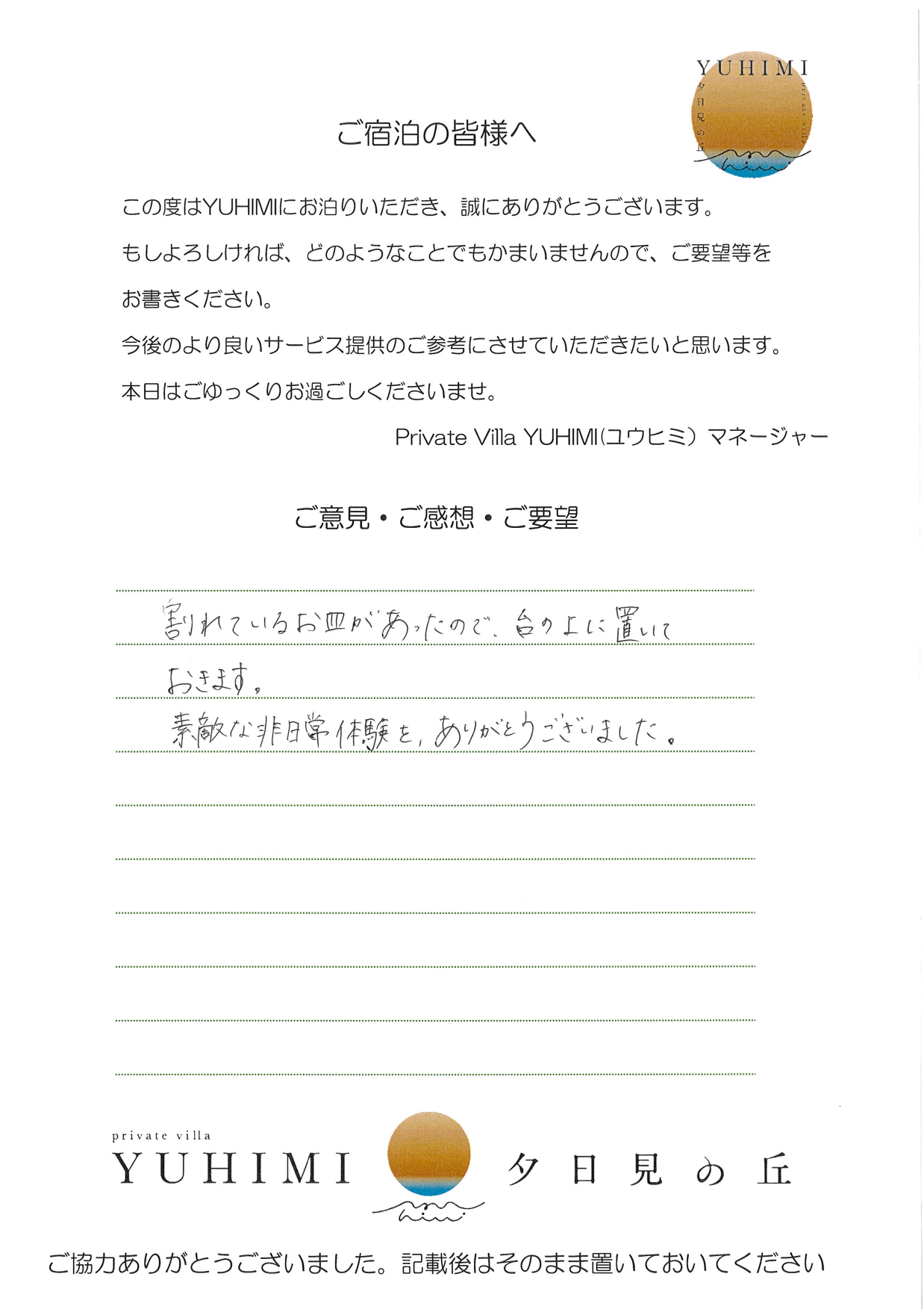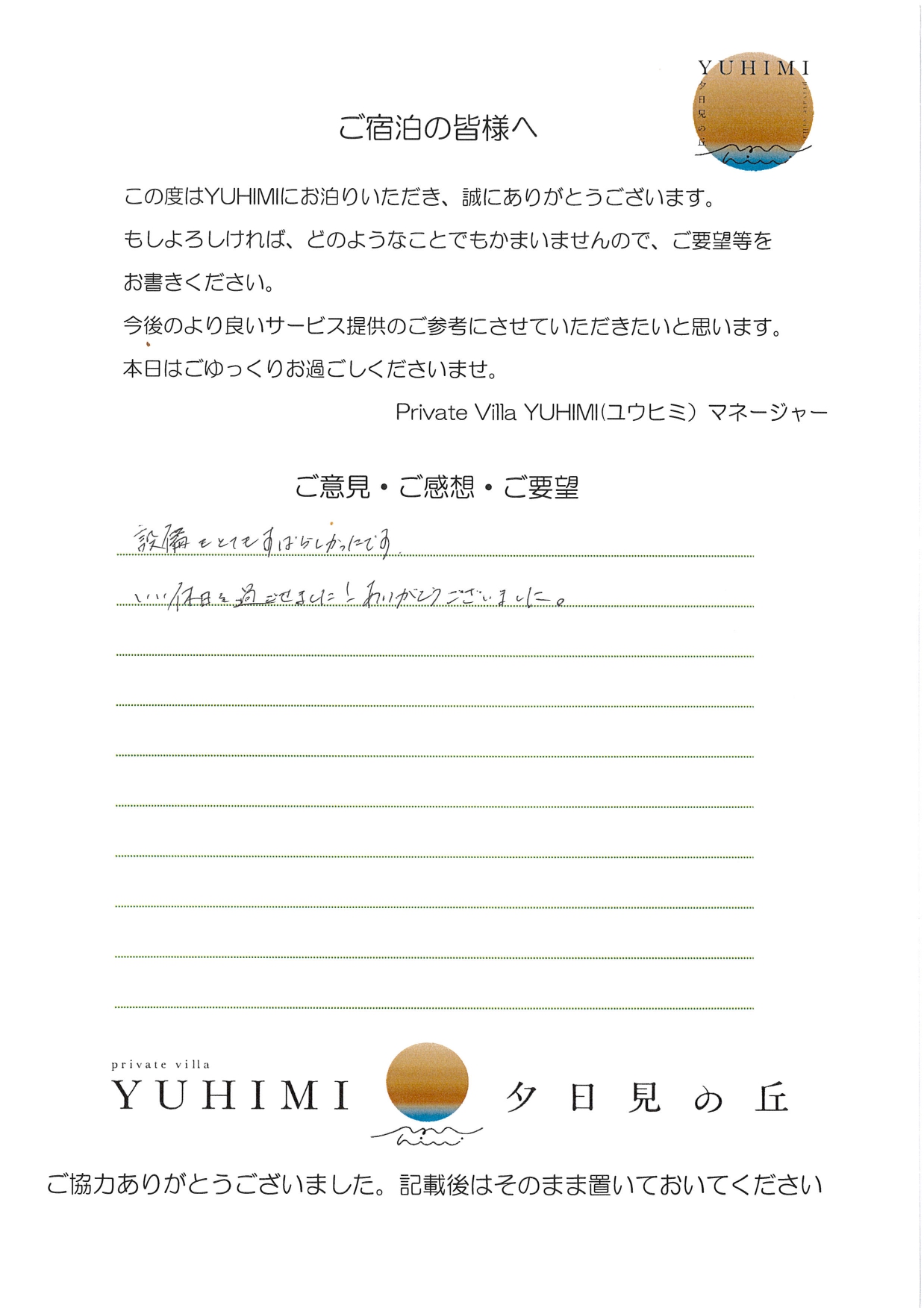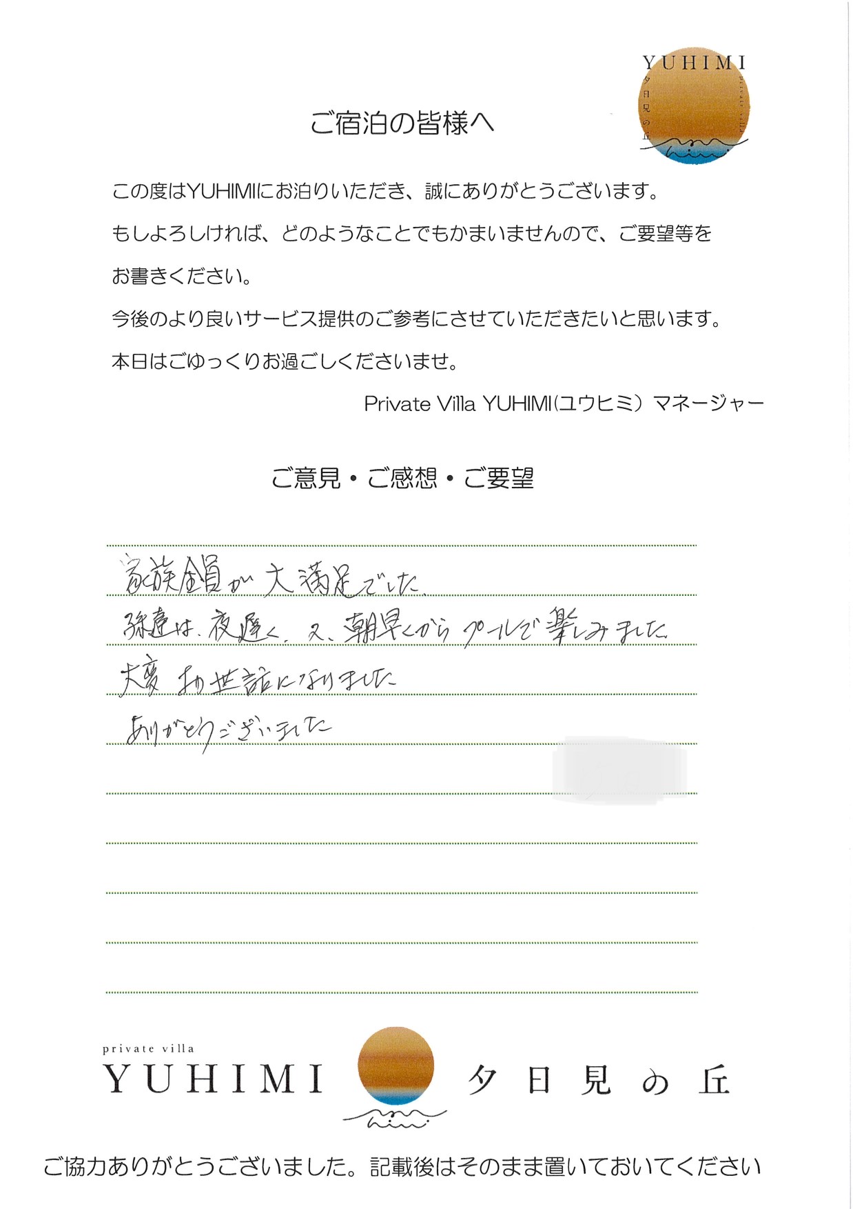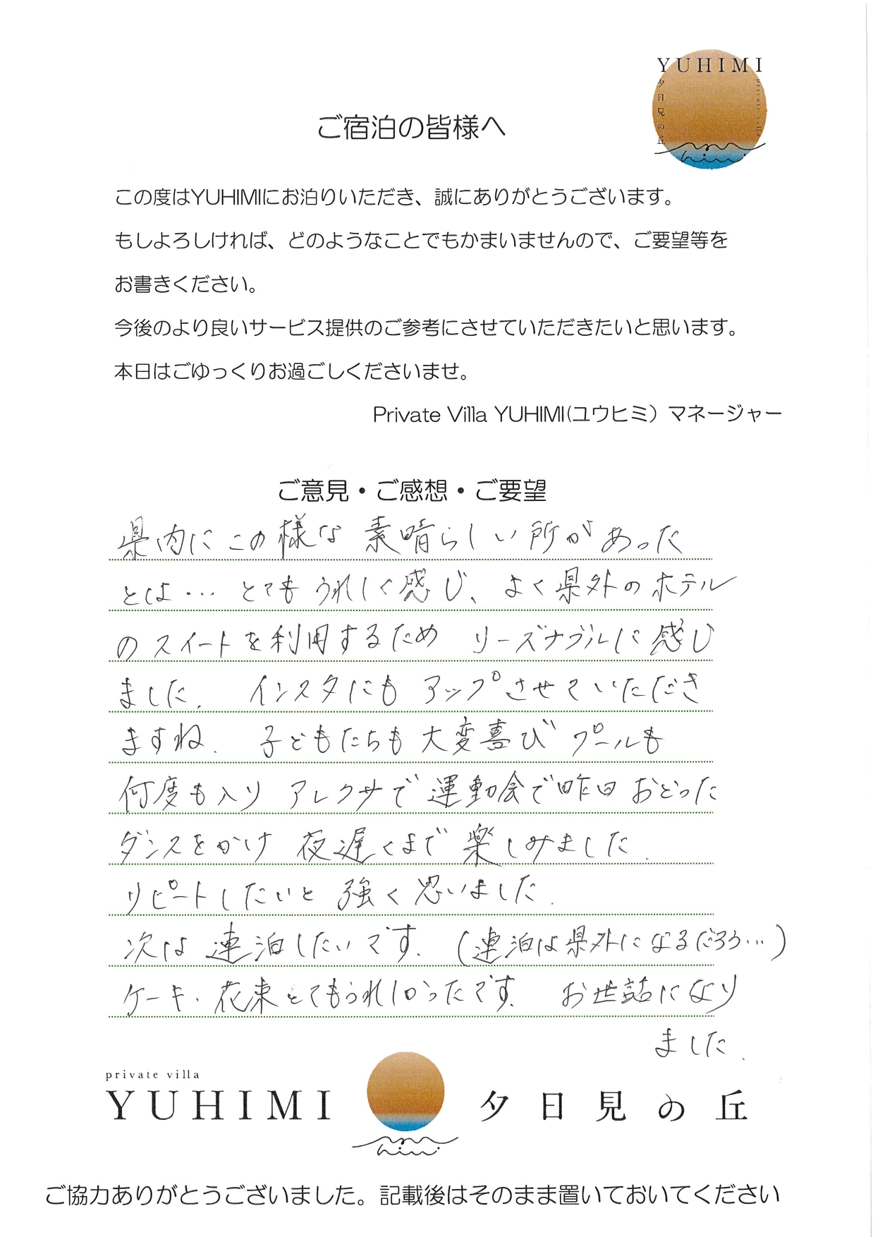 県内のこの様な素晴らしい所があったとは…とてもうれしく感じ、よく県外のホテルのスイートを利用するため、リーズナブルに感じました。インスタにもアップさせていただきますね。子どもたちも大喜び、プールも何度も入り、アレクサで運動会で昨日おどったダンスをかけ、夜遅くまで楽しみました。リピートしたいと強く思いました。次は連泊したいです(連泊は県外になるだろう…)ケーキ・花束とてもうれしかったです。お世話になりました。