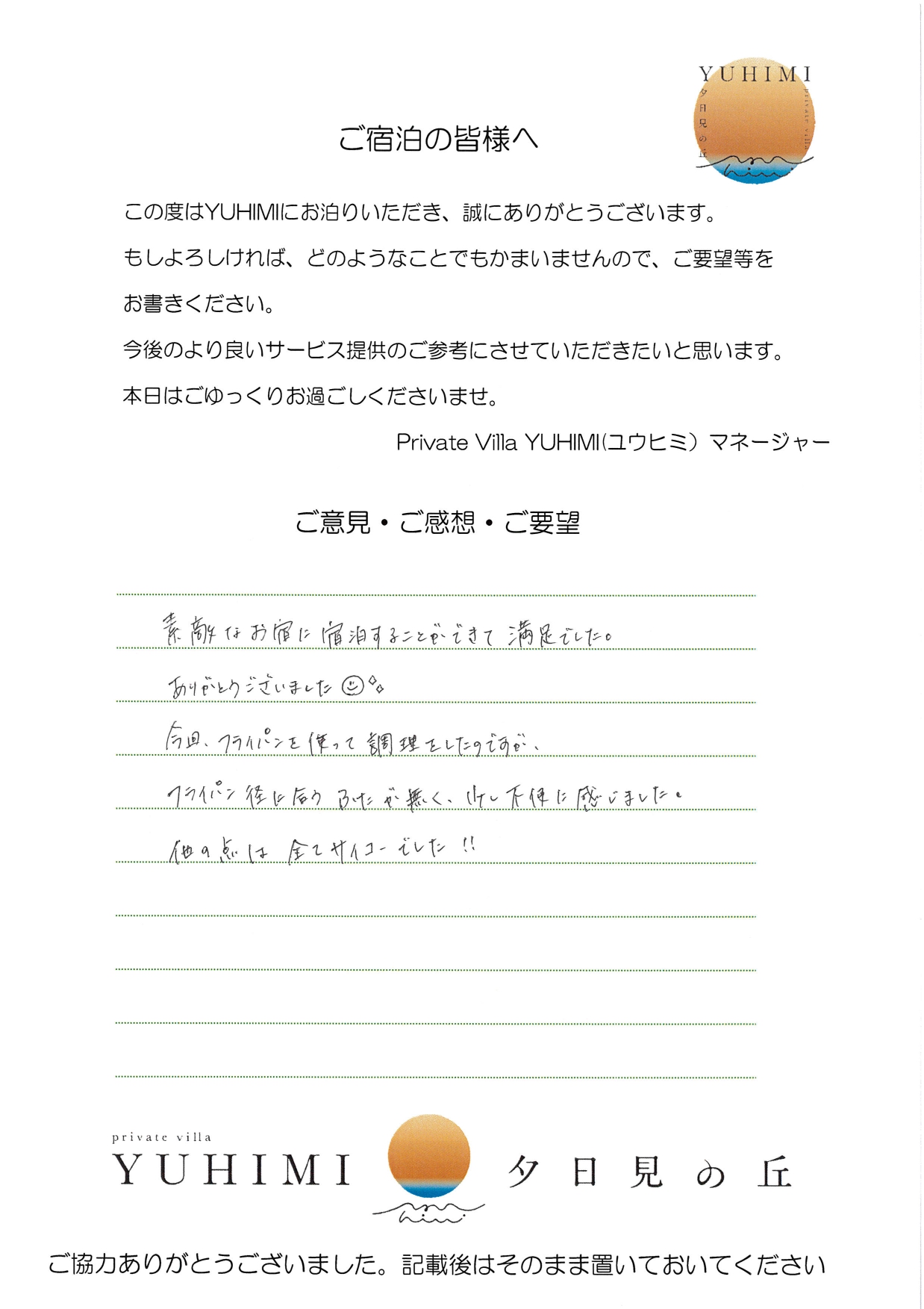 素敵なお宿に宿泊することができて、満足でした。ありがとうございました😊今回、フライパンを使って調理をしたのですが、フライパン径に合うふたが無く、少し不便に感じました。他の点は全てサイコーでした。