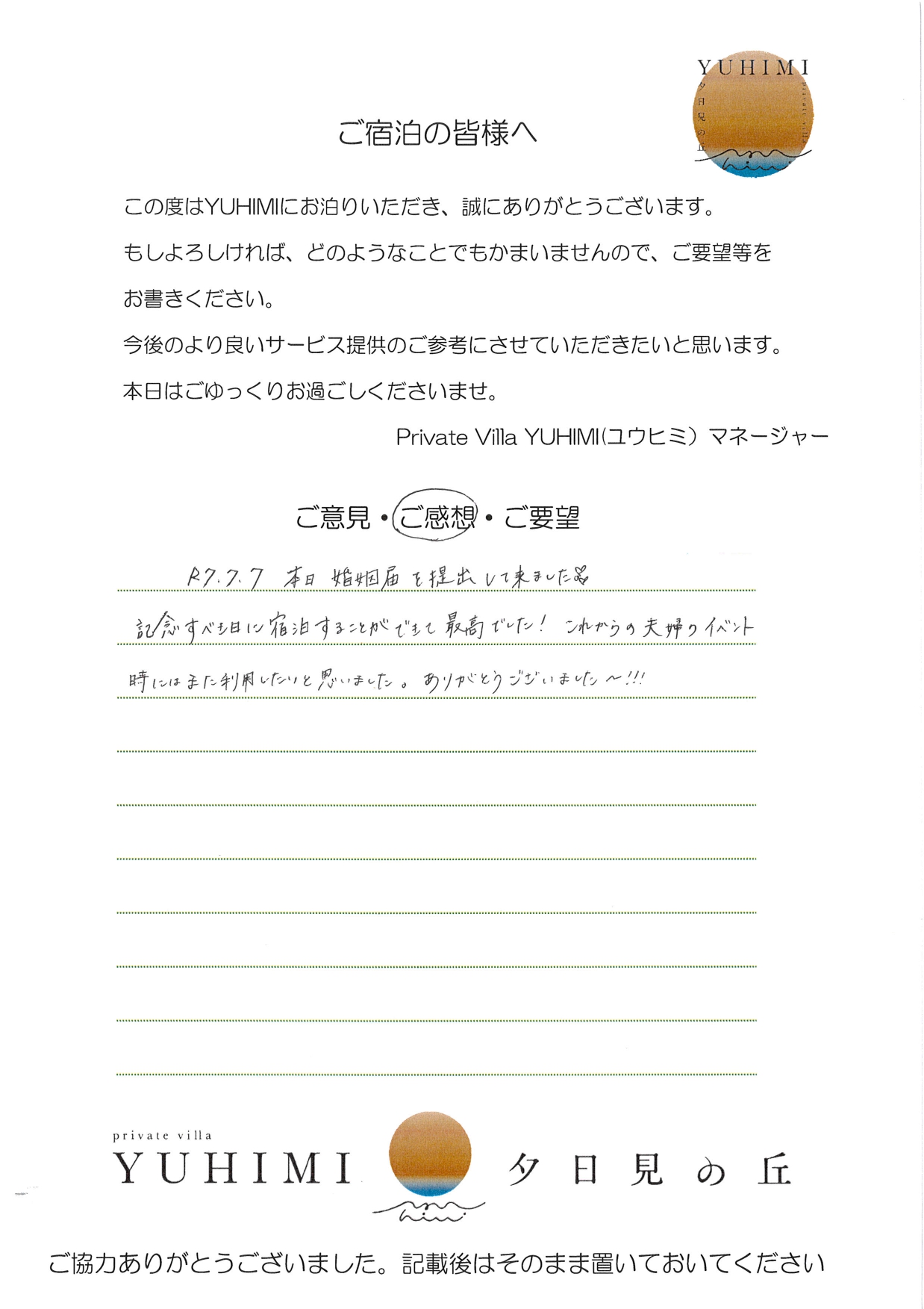 R7.7.7 本日婚姻届けを提出してきました💕記念すべき日に、宿泊することができて最高でした!これからの夫婦のイベント時にはまた利用したいと思いました。ありがとうございました~!!!