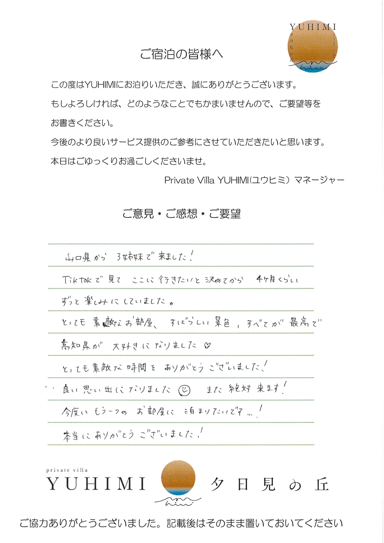 山口県から3姉妹で来ました!Tiktokで見てここに行きたいと決めてから、4か月くらいずっと楽しみにしていました。とっても素敵なお部屋、すばらしい景色、すべてが最高で高知県が大好きになりました💓とっても素敵なな時間をありがとうございました!良い思い出になりました😊また絶対来ます!今度はもう一つのお部屋に泊まりたいです…!本当にありがとうございました!