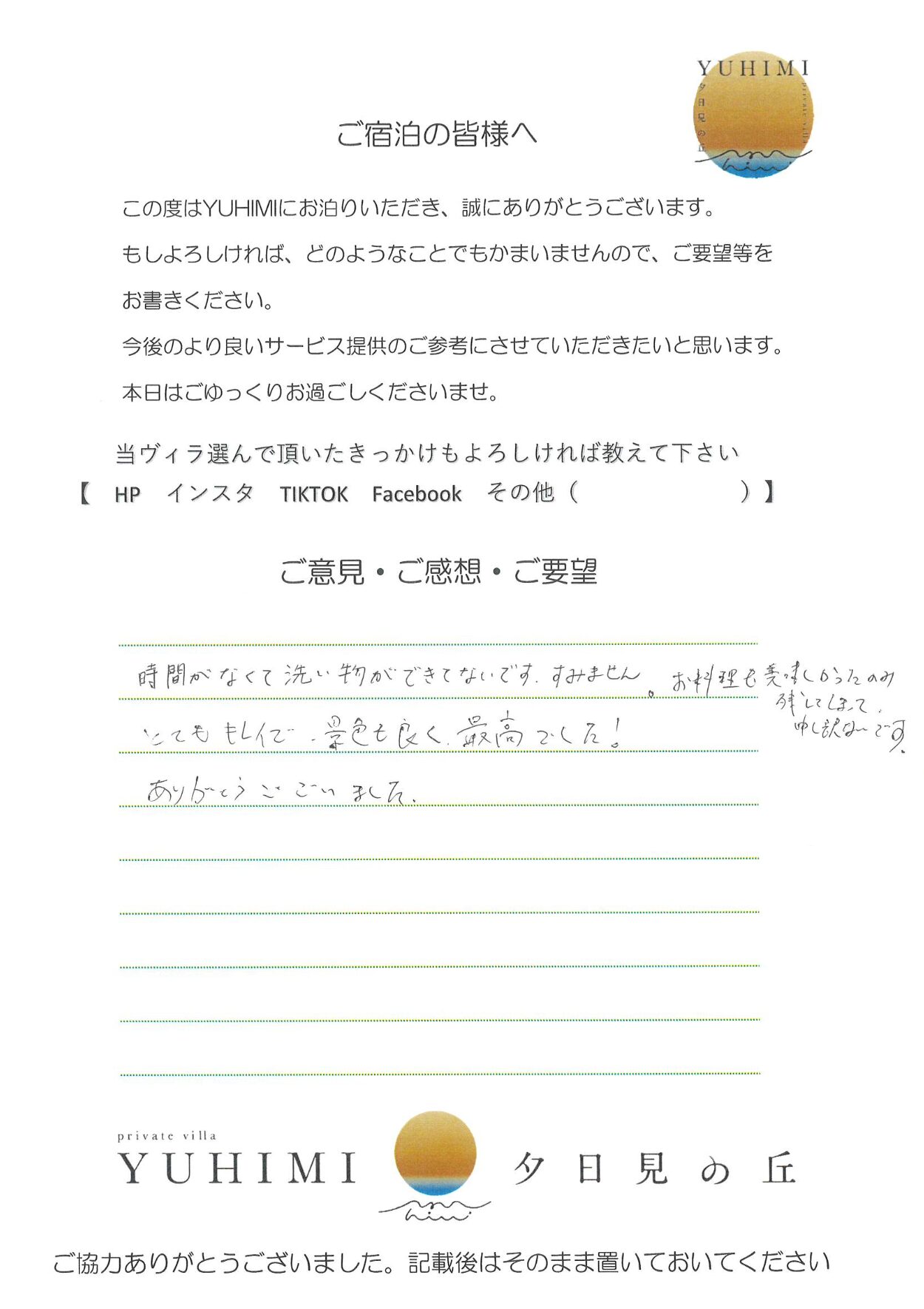 時間がなくて洗い物ができてないです。すみません。お料理も美味しかったです。残してしまって、申し訳ないです。とてもキレイで景色もよく、最高でした!