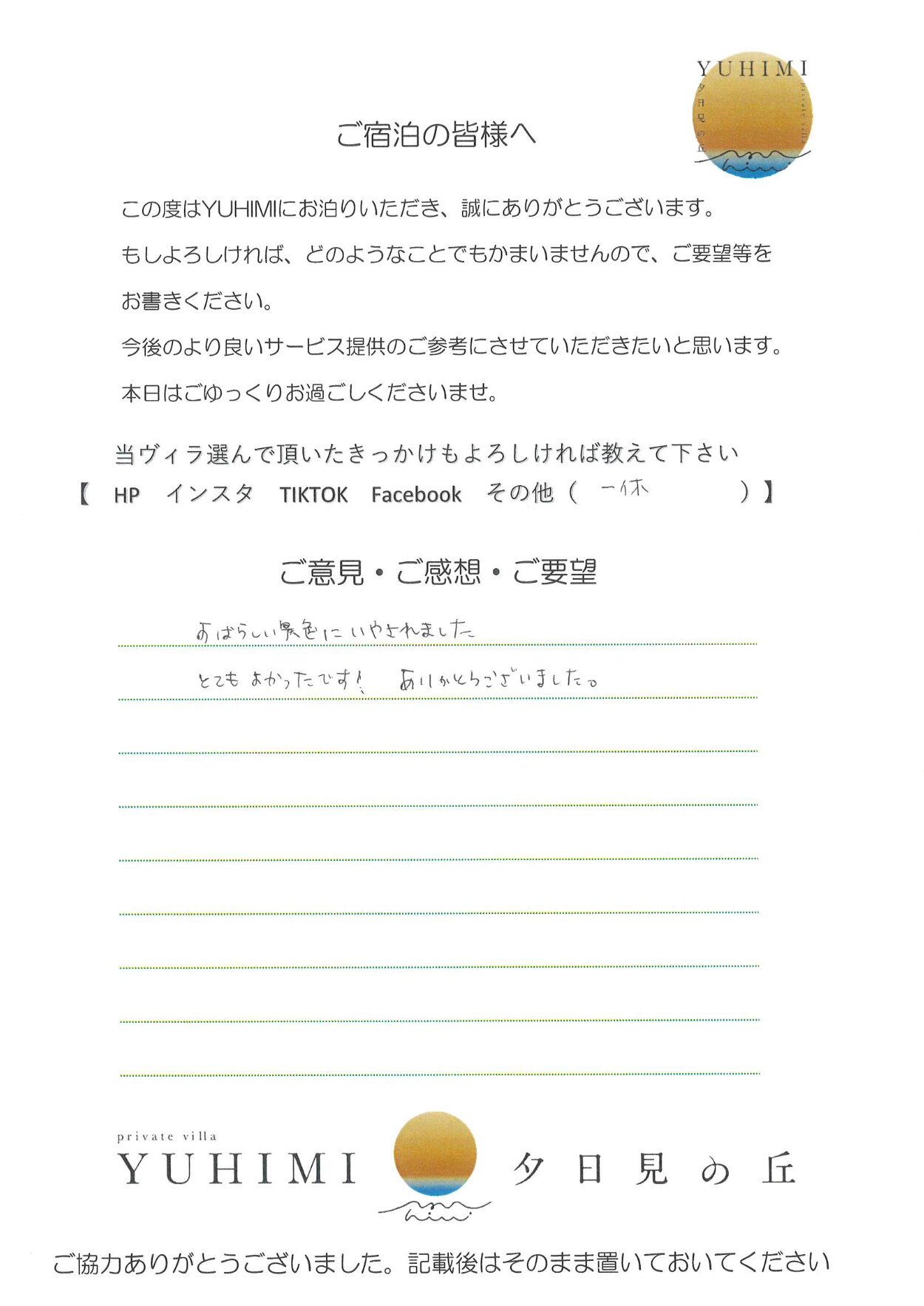 すばらしい景色にいやされました。とてもよかったです!ありがとうございました。