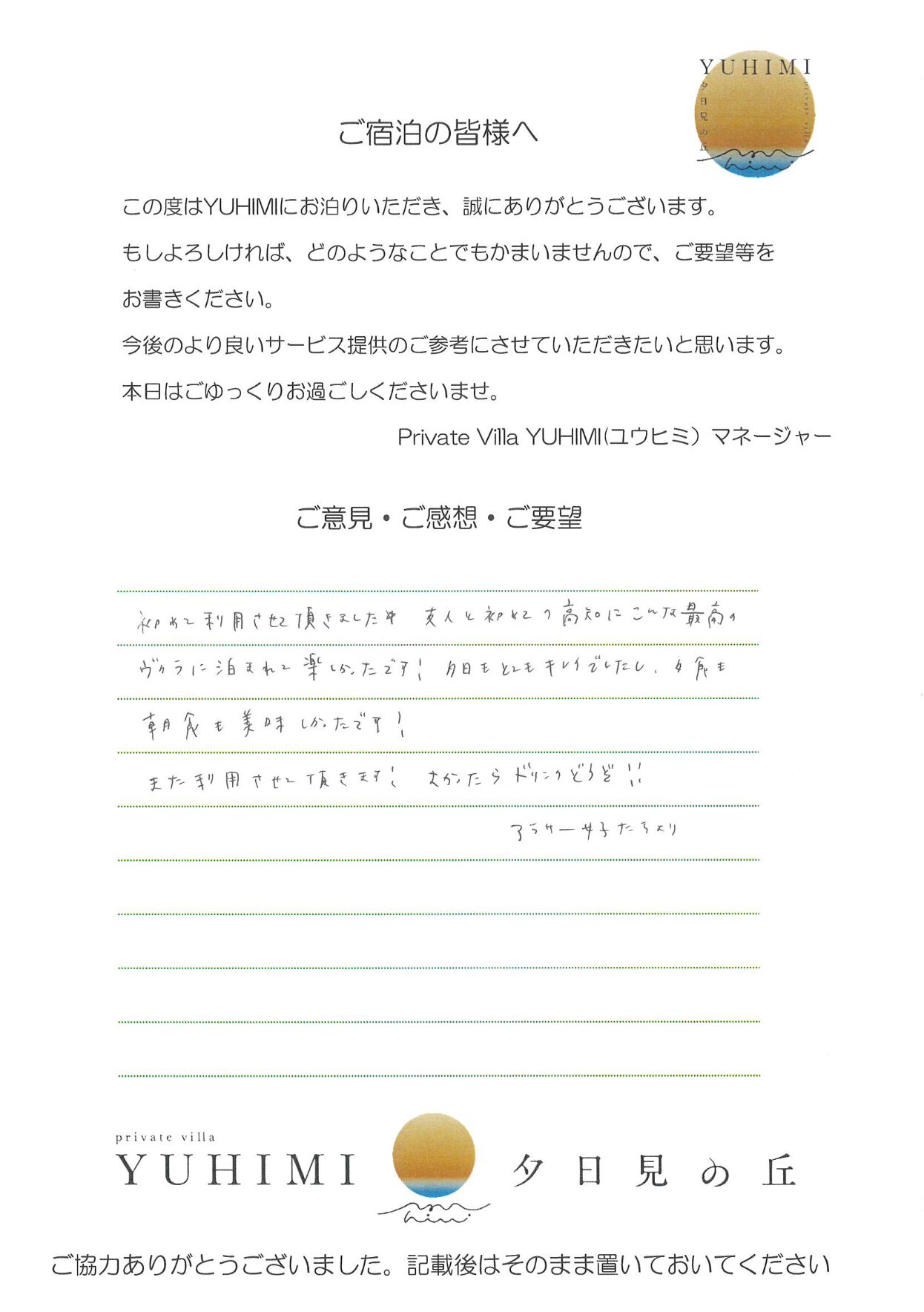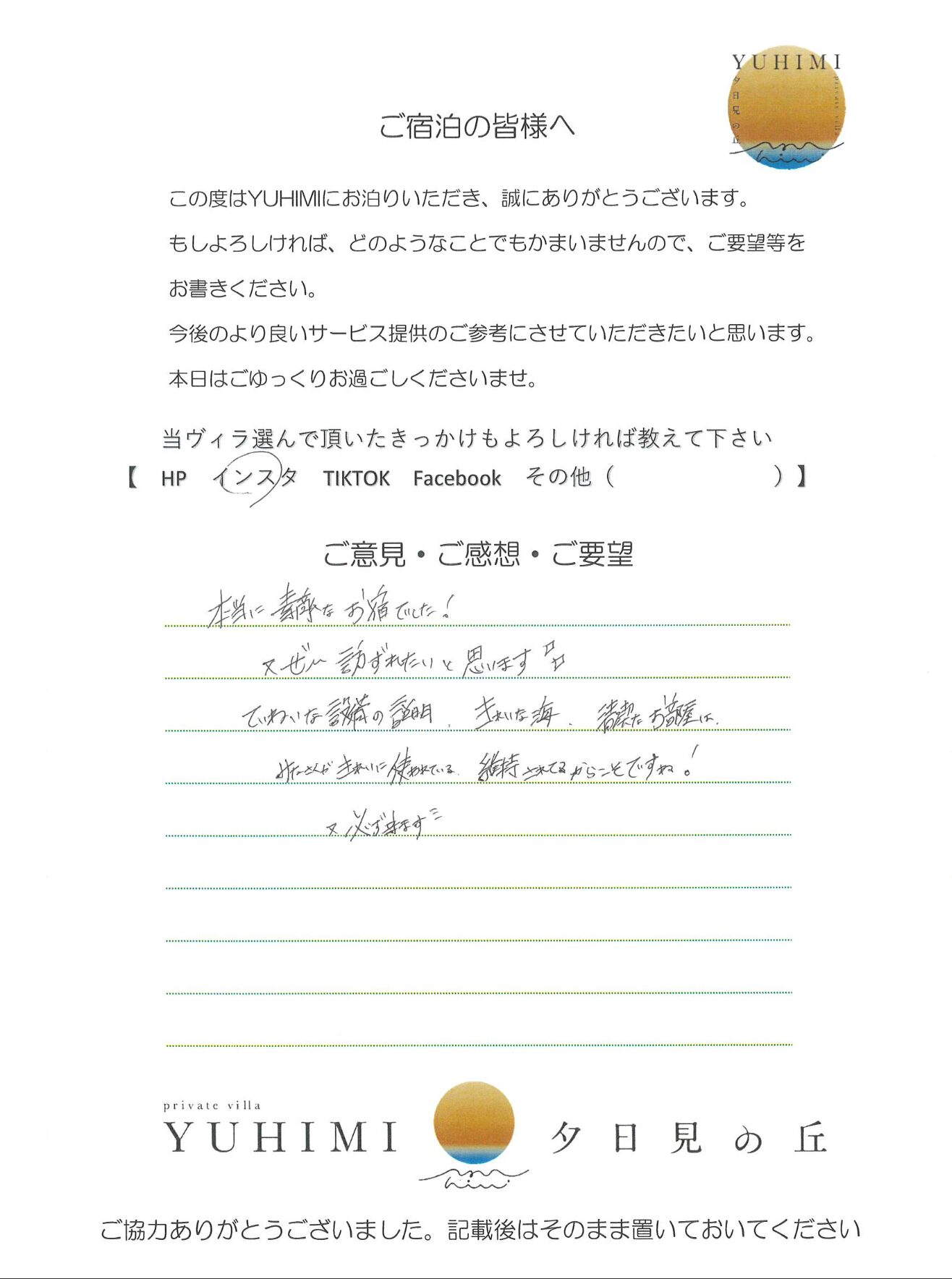 本当に素敵なお宿でした。又ぜひ訪れたいと思います。ていねいな設備の説明、きれいな海、清潔なお部屋はみなさんがきれいに使われている。維持されてるからこそですね!