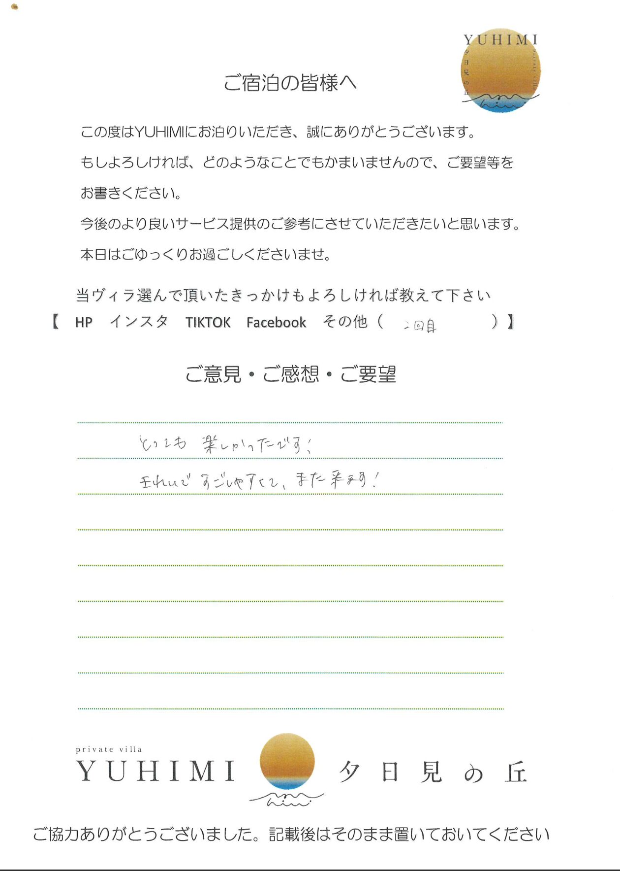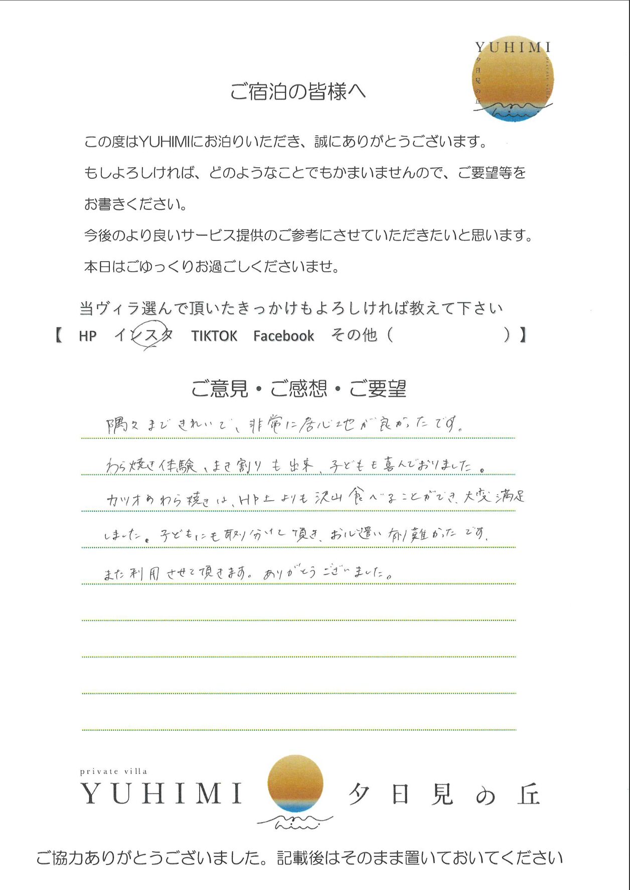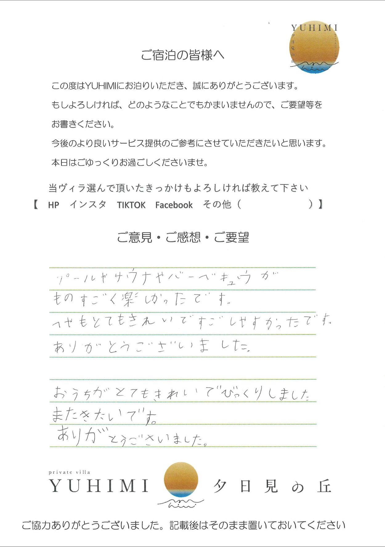 プールやサウナやバーベキュウがものすごく楽しかったです。へやもとてもきれいですごしやすかったです。ありがとうございました。おうちがとてもきれいでびっくりしました。たまきれいです。ありがとうございました。