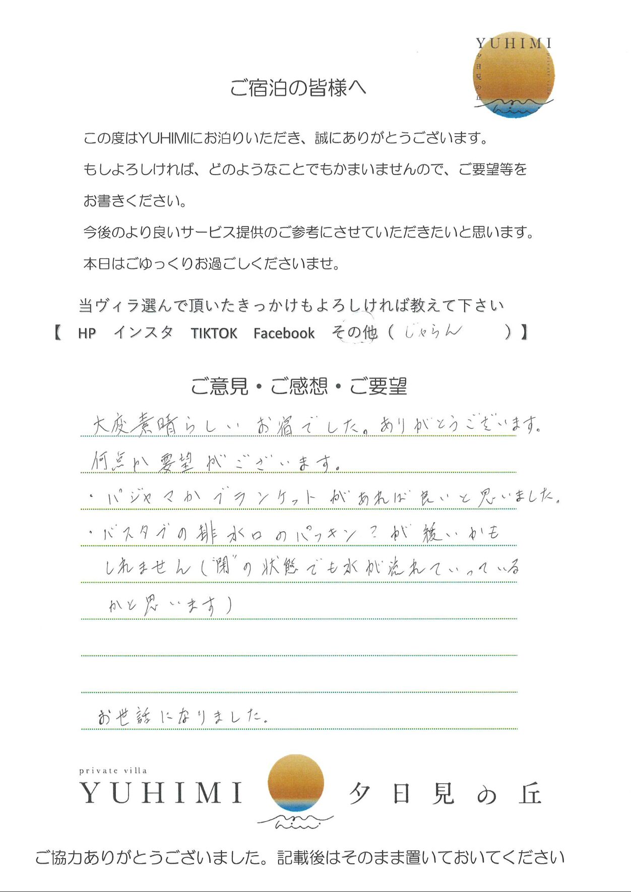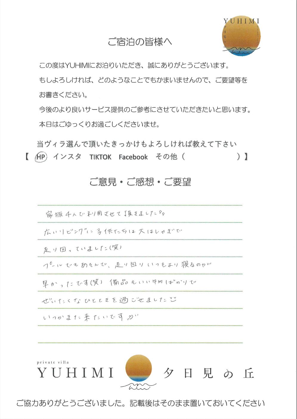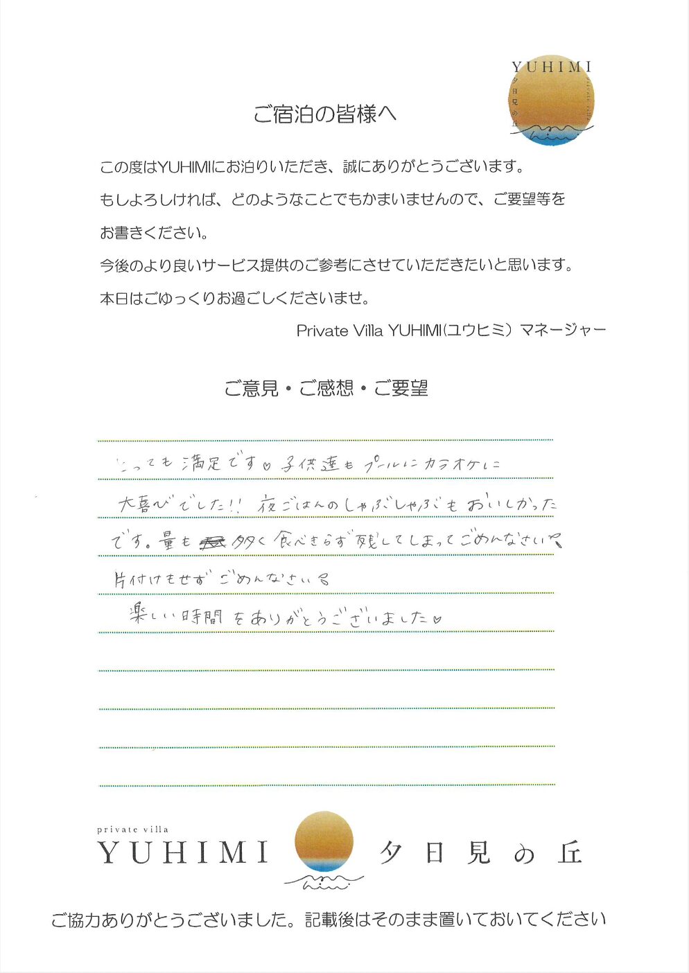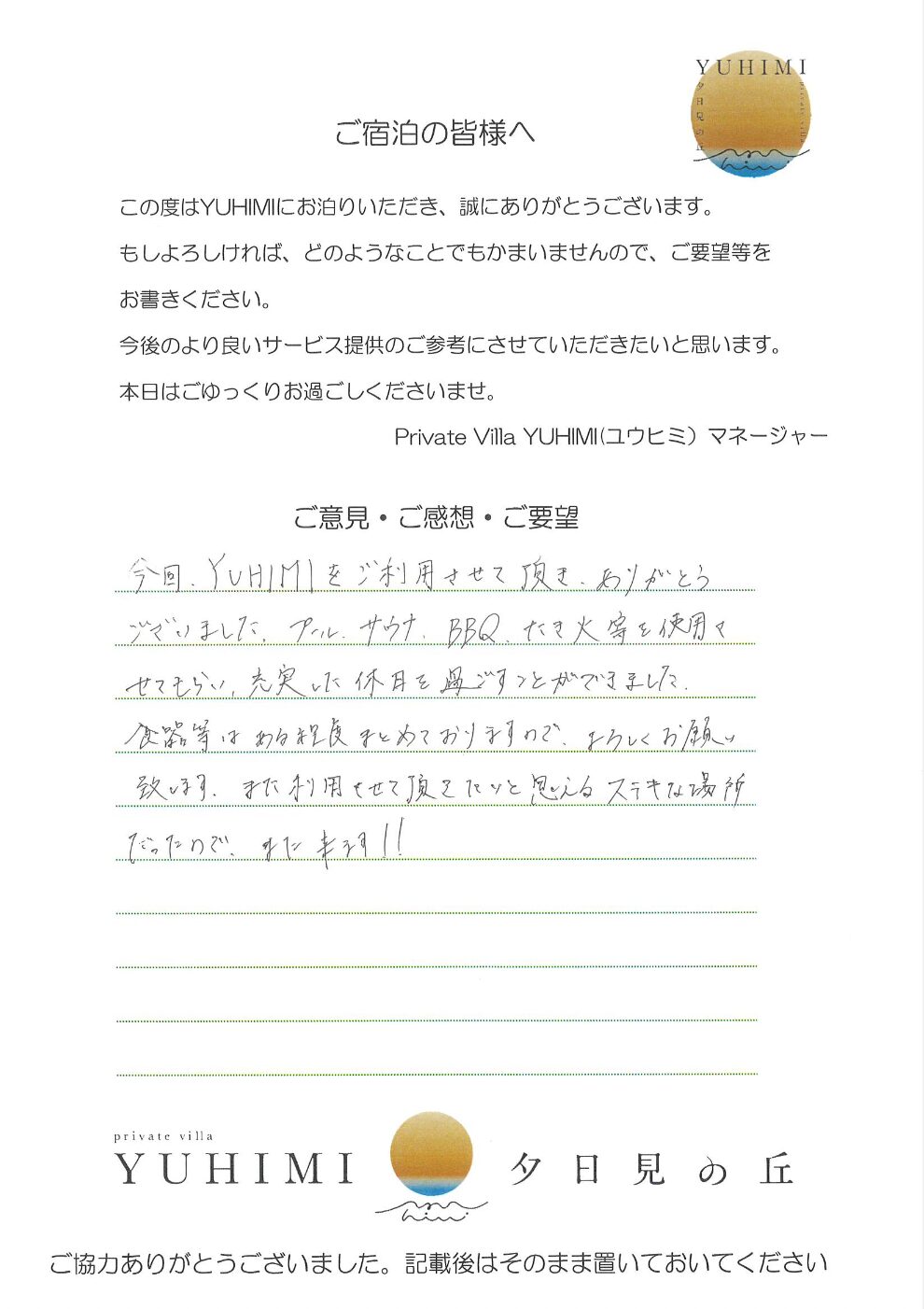 今回、YUHIMIをご利用させて頂き、ありがとうございました。プール、サウナ、BBQ、たき火等を使用させてもらい、充実した休日を過ごすことができました。食器等はある程度まとめておりますので、よろしくお願い致します。また利用させて頂きたいと思えるステキな場所だったので、また来ます!!