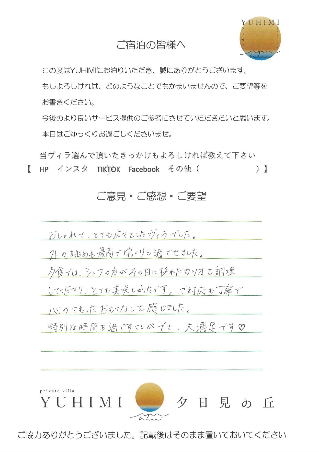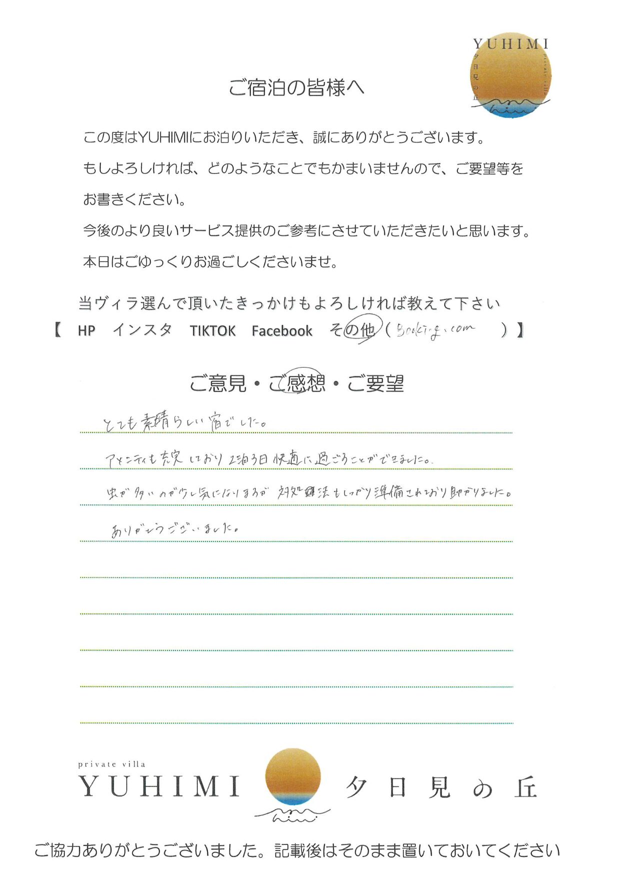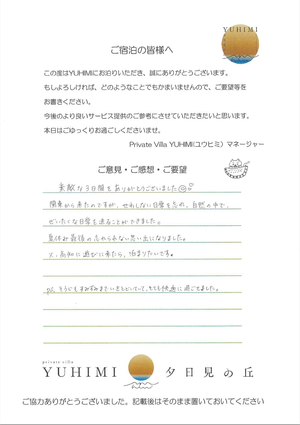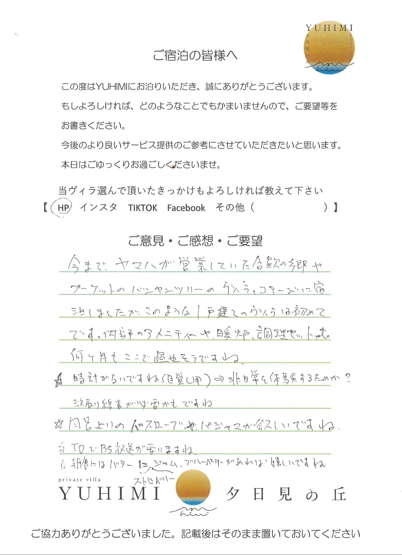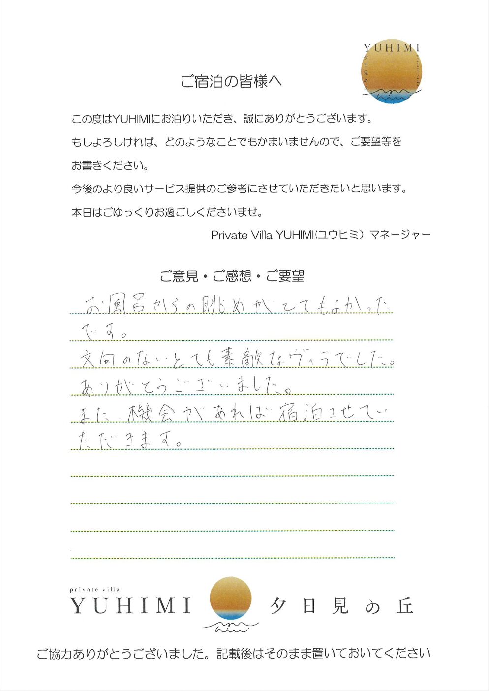 今回、YUHIMIをご利用させて頂き、ありがとうございました。プール、サウナ、BBQ、たき火等を使用させてもらい、充実した休日を過ごすことができました。食器等はある程度まとめておりますので、よろしくお願い致します。また利用させて頂きたいと思えるステキな場所だったので、また来ます!!