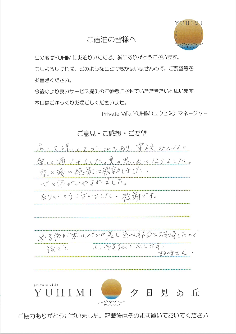 広くて涼しくてプールもあり、家族みんなで楽しく過ごせました。夏の思い出になりました。空と海の絶景に感動しました。心と体がいやされました。ありがとうございました。感謝です。