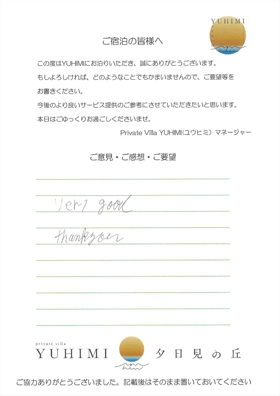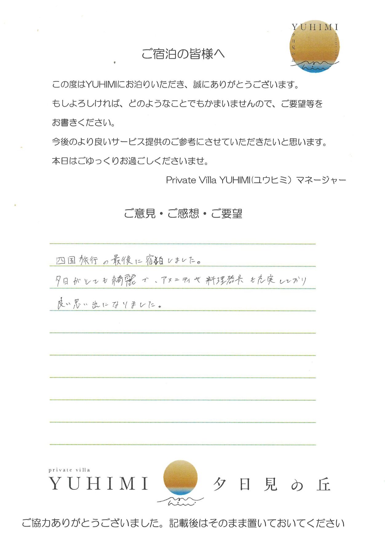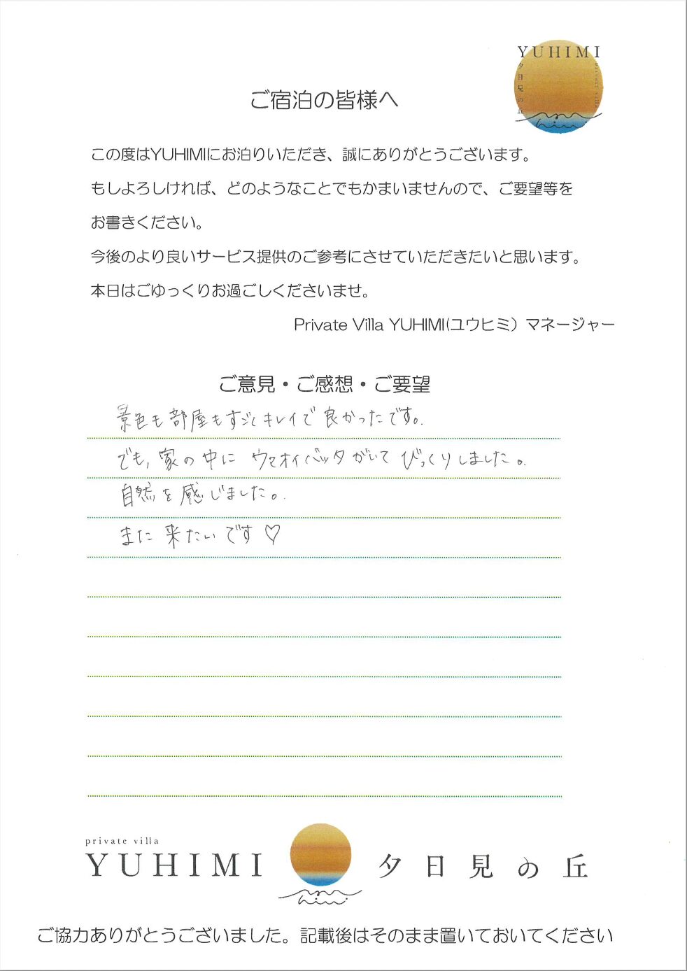 景色も設備も素晴らしかったです!滞在中2度害虫にそうぐうし若干テンションが下がりましたが、立地上仕方ないですね・・・次はY2のお部屋にも宿泊してみたいです。ありがとうございました!